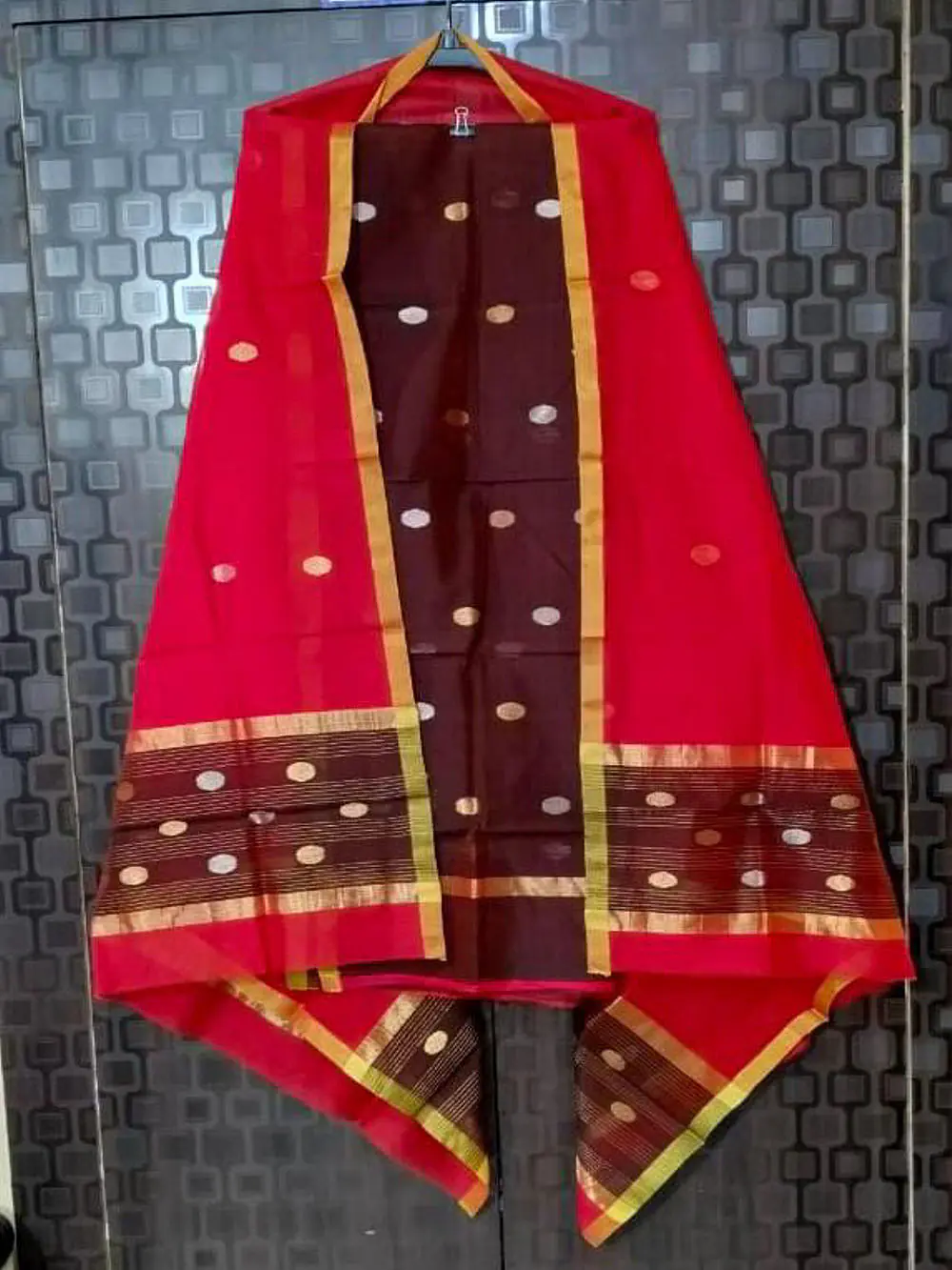 Discover the timeless allure of Indian textiles with this stunning Chanderi dress material.woven with a masterful blend of silk and cotton,this fabric captures the essence of sophisticated grace,offering a garment that is both incredibly light and sepremely elegant.