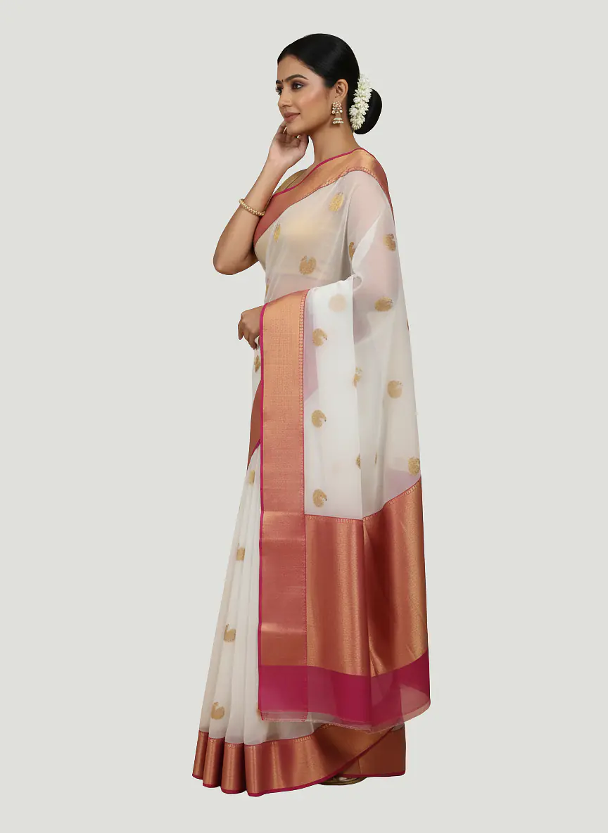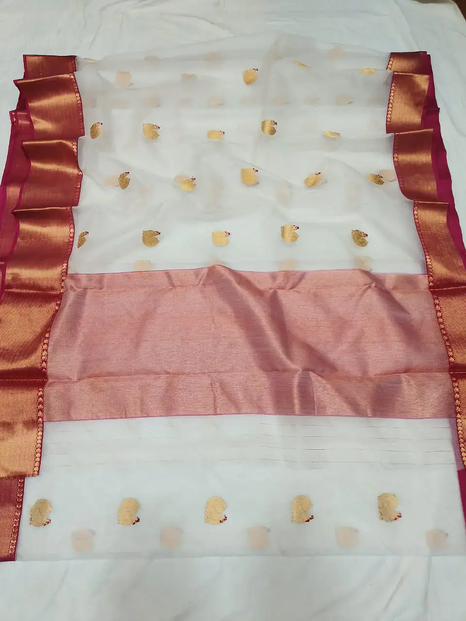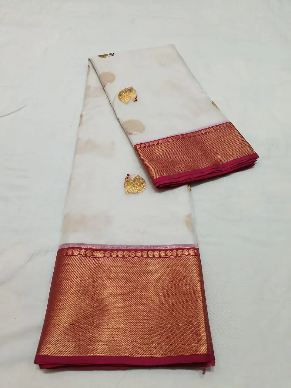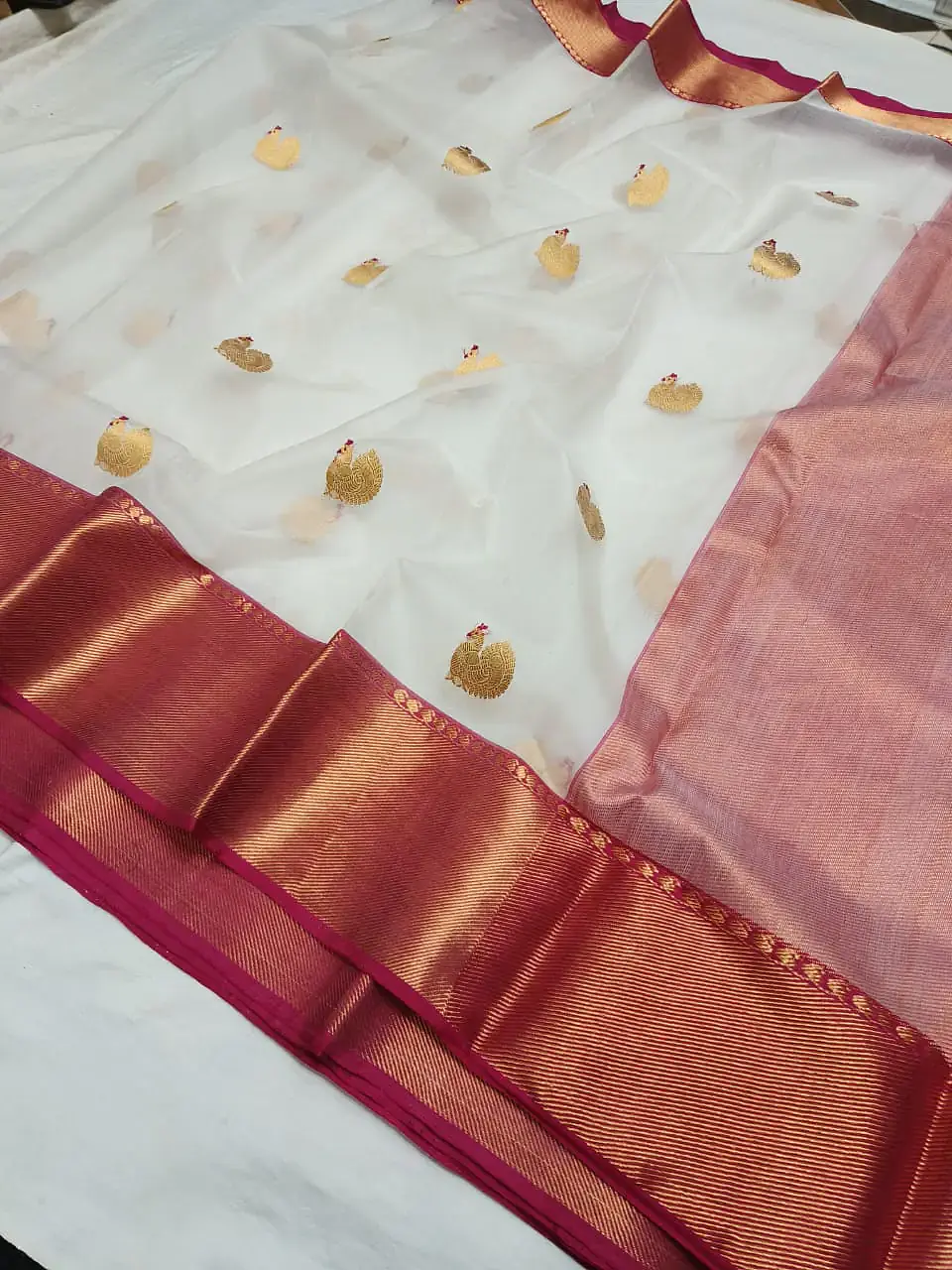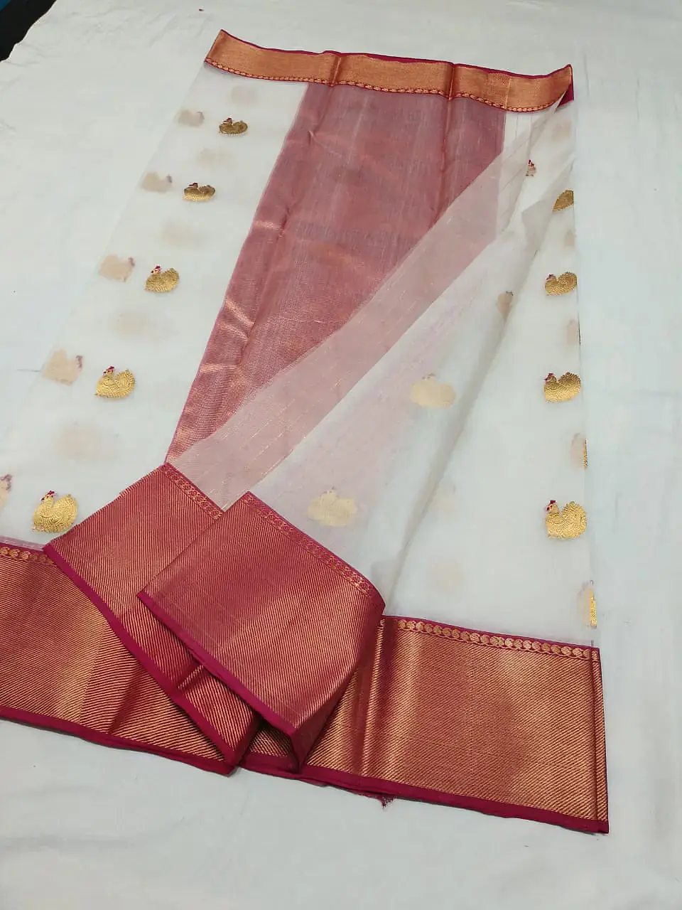 CHANDERI MURGA SAREE KATAN SILK BORDER RED COTTON MASRAIES WITH GOLDEN JARI WORK WITH BLOUSE PIECE