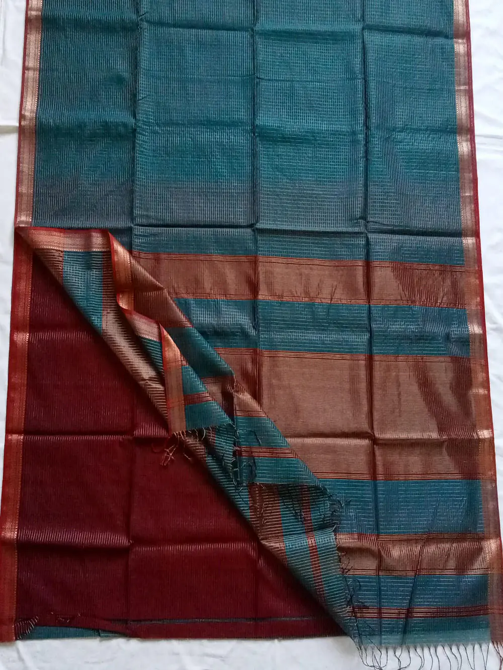 This handloom product of Kasrawad Art Cluster is woven by our registred weavers.Maheswari handloom Saree is a cotton and pure silk fabric woven with zari or brocade in varied designs. These designs include stripes, checks and floral borders. Originating from the town of Maheswar, Madhya Prades.