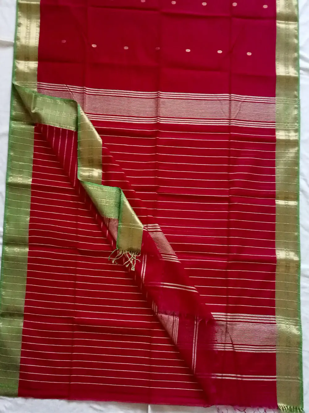 This handloom product of Kasrawad Art Cluster is woven by our registred weavers.Maheswari handloom Saree is a cotton and pure silk fabric woven with zari or brocade in varied designs. These designs include stripes, checks and floral borders. Originating from the town of Maheswar, Madhya Prades.